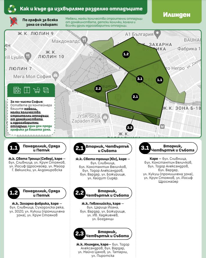 Запознайте се с ежеседмичния график, съгласно който се събират и сметоизвозват мебели, малки количества строителни отпадъци от домакинствата, детски колички, колела и всички други едрогабаритни отпадъци, които гражданите е силно препоръчително, да поставят в определените за това места ден по-рано, както как и къде да изхвърляте разделно различни видове битови отпадъци чрез следните изображения: